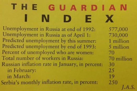 But in Russia, the ostensible loser of the Cold War, 1993 was the most brutal of the post-collapse years. The country was two years into Yeltsin’s disastrous “shock therapy” approach to insta-Capitalism. The State, which had meddled in the most minute details of people’s lives for the past 75 years, threw up its hands and said, “Y’all are on your own now; sorry about that.”
